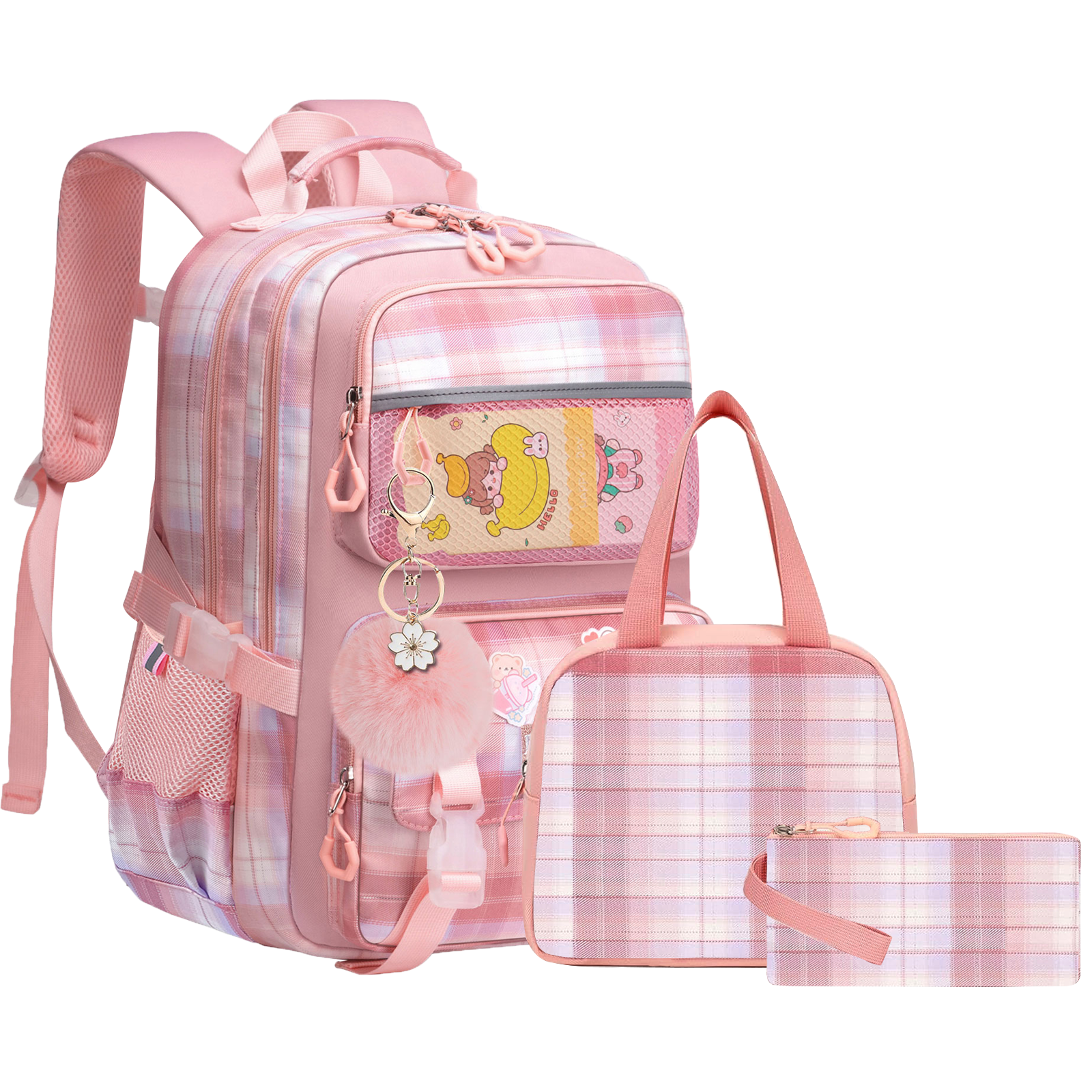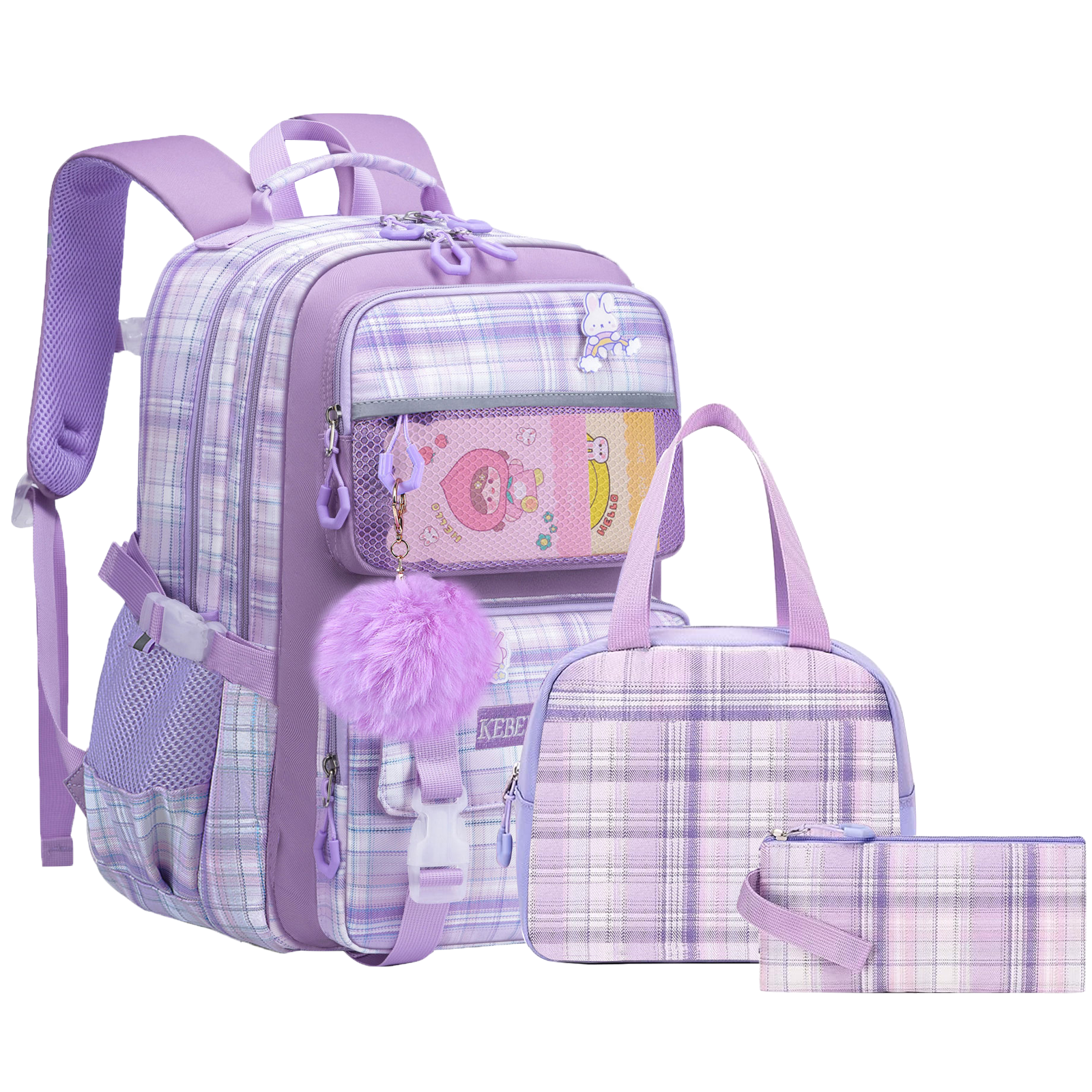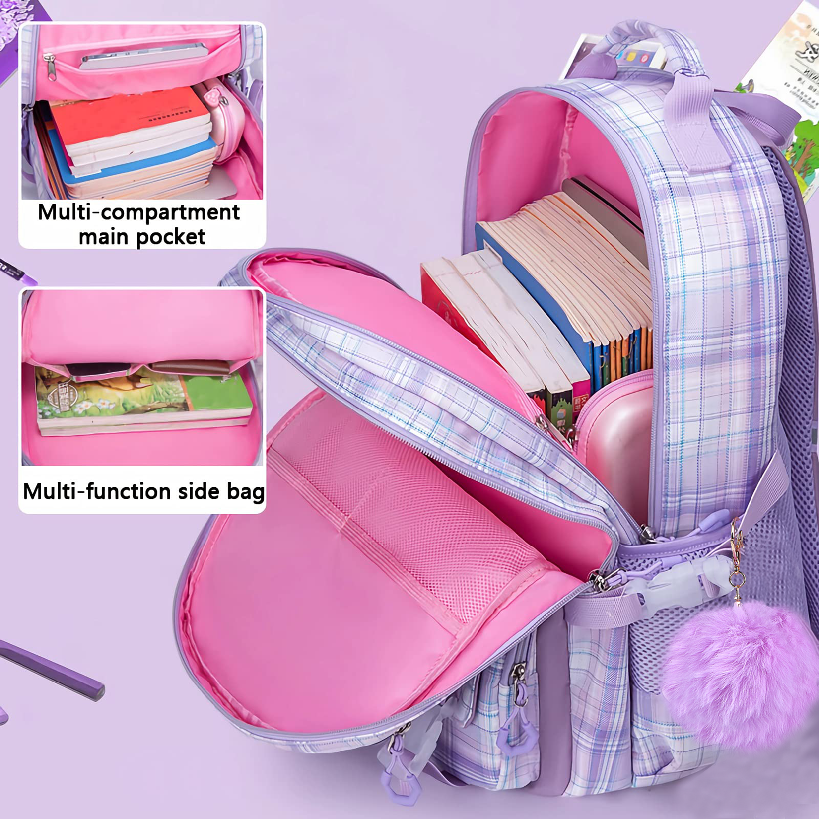 Chic & Cute Style:Designed with a trendy plaid pattern and finished with a soft furry pendant, this backpack set brings a sweet, cheerful vibe that girls will love for both school and travel.