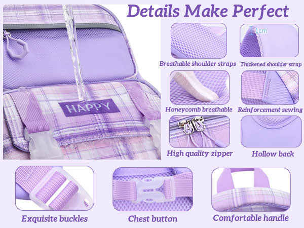 Our school bag provides your child's comfort with widened 7cm shoulder straps and thick 1cm padding, featuring an S-curve design that perfectly fits the shoulders and honeycomb ventilated material to prevent heat discomfort. The cute backpack is equipped with a balanced chest buckle and pressure-free back padding, and comes as a complete 3-piece set including a matching insulated lunch bag and coordinating pencil case for all school needs.