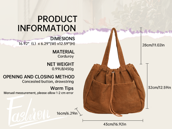 【Trendy Design & Versatile Style】The Corduroy Tote Bag for Women can effortlessly complementing any outfit. With dimensions of 16.92'' x 6.29'' x 12.59'' and a comfortable 22.44" shoulder strap, it's perfect for a variety of occasions, from office wear to weekend outings. Available in multiple stylish colors to suit every taste.