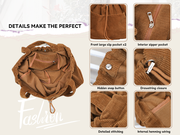 【Spacious & Organized】Boasting a generous 22L capacity, this corduroy bag can easily accommodate your daily essentials. The main compartment features an internal zip pocket for valuables, while 2 spacious front pockets offer quick access to your must-haves, keeping you organized on the go.